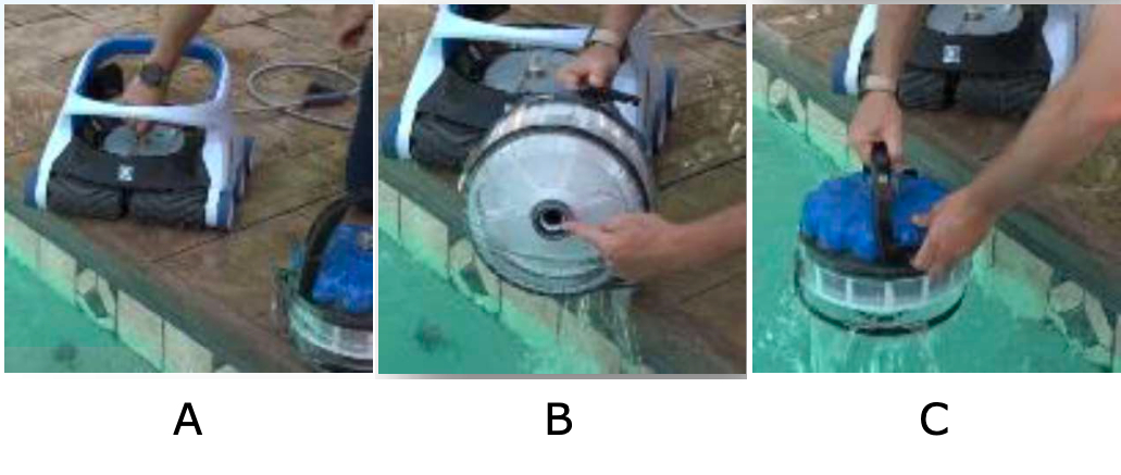 Was de as/lagers en waaier door deze op en neer te bewegen in het zwembad en draai de onderste koppeling met uw vinger totdat de as vrij kan draaien (Afbeelding C)